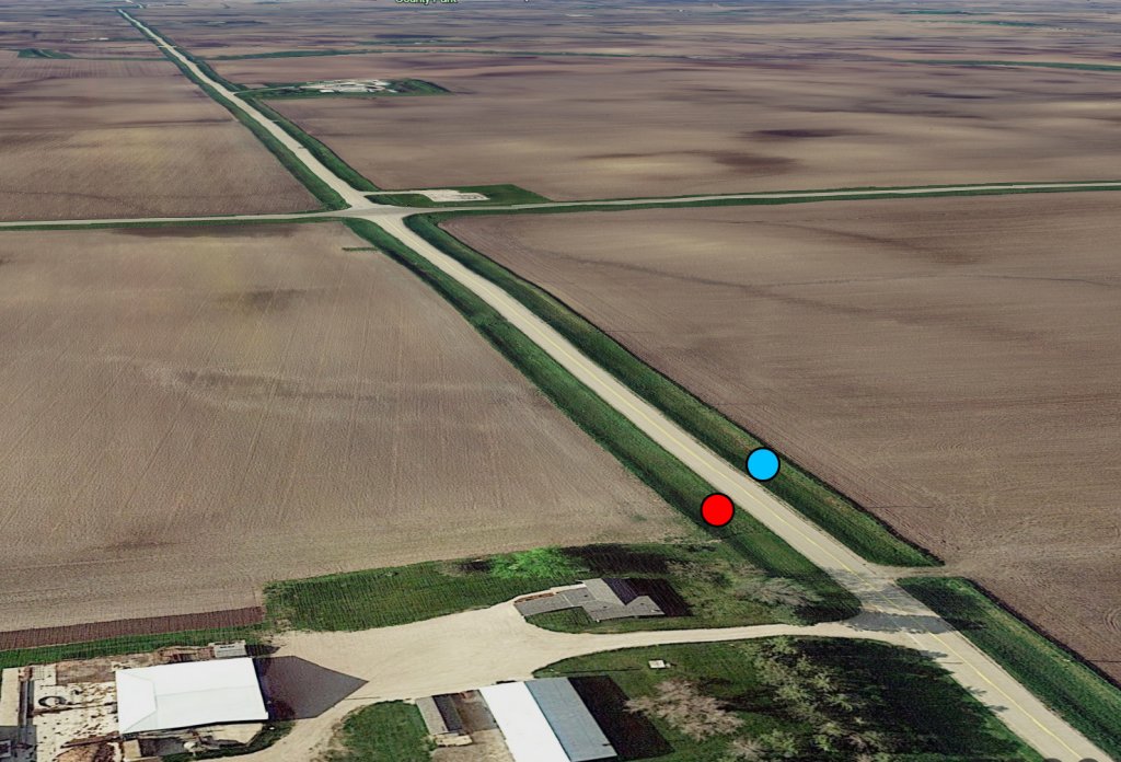 Which means David's truck was parked right next to a farm entrance. Not in the middle of nowhere with nobody around and nowhere to go to get help. Red is the approximate truck location, blue is roughly where the reporter is standing: