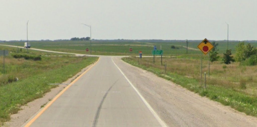 You’re right. Here’s another shot with me heading west on 20. To the right is the part of the exit you’d be on if you wanted to get off 20 as in your pic, and head north or south on 71. Vehicles on 20 would not even be able to see what’s taking place down there easily. So if most traffic was flying by on 20, they may just see two stopped vehicles, if they even glanced that way at all. But, the lights at the exit do bother me. Not a very stealth way to stop someone. What if two other cars happened to be there at the same time?