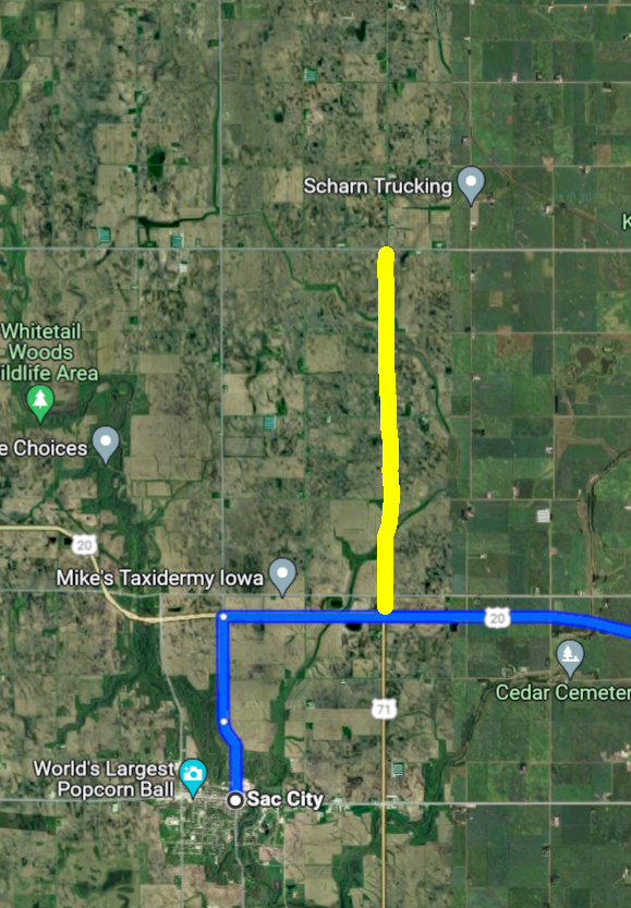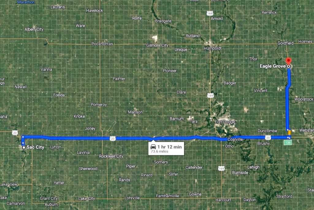 I'd been assuming (never assume!) Eagle Grove to Sac City would take a route something like this, all driving south and west: