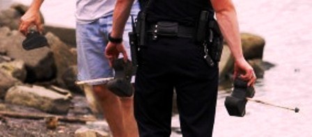 Hmm...when I first looked at the photo, I thought officer was holding a camera in his right hand...but then I noticed he seems to be holding an identical item in his left hand, so not a camera. (:
