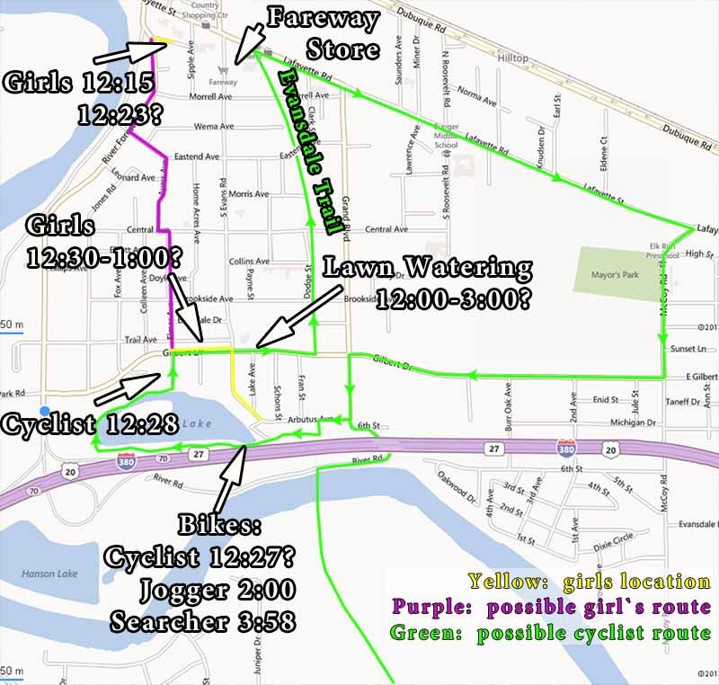 There is a time problem with SierraShelby's account. According to LE, the girls were sighted on Brovan Blvd (very close to Elizabeth's home) at 12:23 pm. SierraShelby saw two bicycles on the trail shortly before he received a call on his cell phone at 12:27 pm.