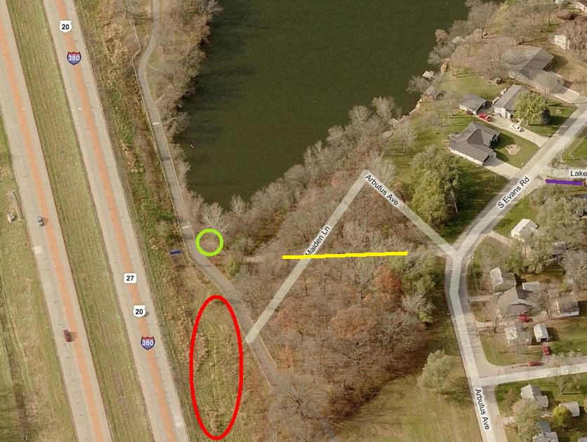 Also, we got pics of Lederman's with the last-known sighting area and the Collins home in the background. Also got pics of the trail where it leads away from Lafayette and heads down towards the school, the skatepark, and eventually the lake.