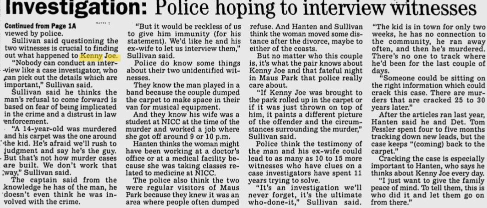 After reading the article, I am even more suspicious of the owner of the carpet. He dumped the carpet out of his van to make room for equipment? Who carries a roll of carpet around in their van? Also, somebody who is in a band would have a prime opportunity to come in contact with Kenny Joe.