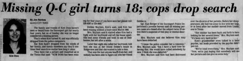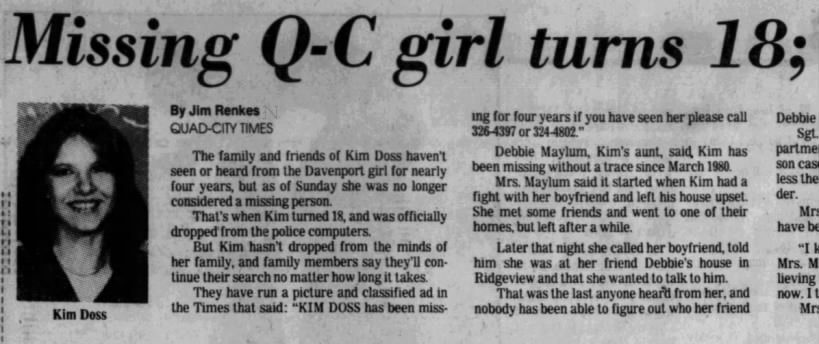 Kimberley Sue Doss has not been seen or heard from since she called her mother in March of 1980. She was supposed to travel from Davenport Iowa to Houston Texas by bus with a one night stop in Chicago. It is unknown if she ever left Davenport, if she made it to Chicago. What is known is she was going home to her mother and never arrived.