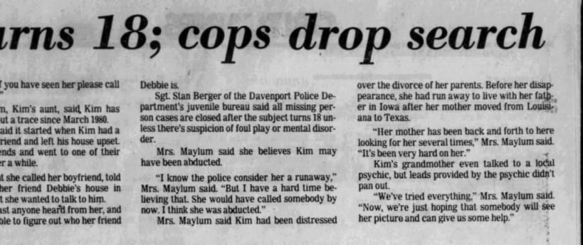She finally opted to relocate to Davenport on 1982 in order to file a formal missing person report and focus her search there. On September 1, 1982 the official missing person report was file in Davenport Iowa as that was the last place she was physically seen. Kimberly was 16 years old at that time.