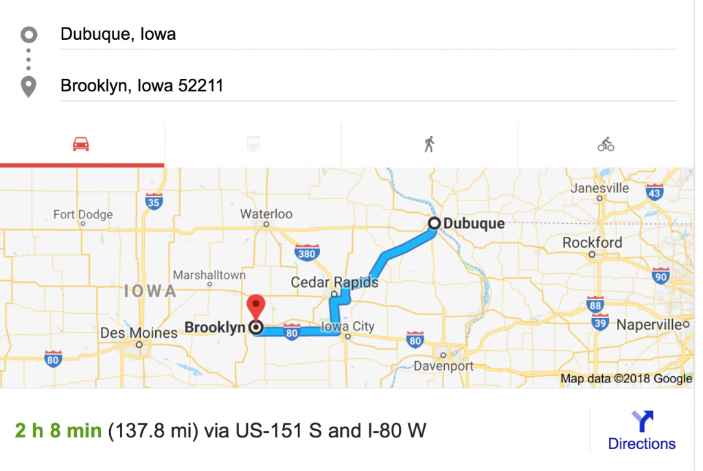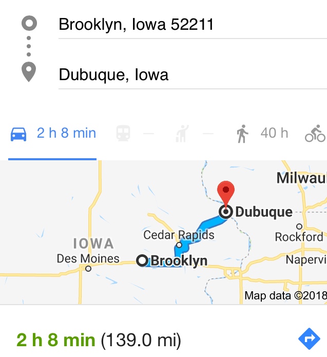 Brooklyn IA is 2 hrs and 8 mins from Dubuque IA according to Google.