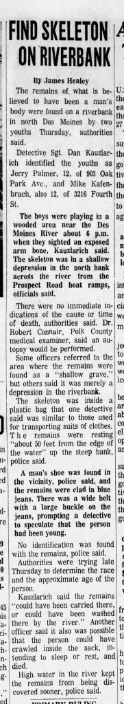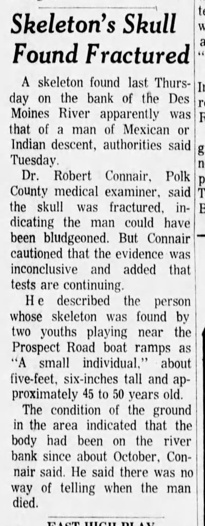 Circumstances of Recovery These remains were found on 03/09/1972 in Des Moines (Polk County), IA.