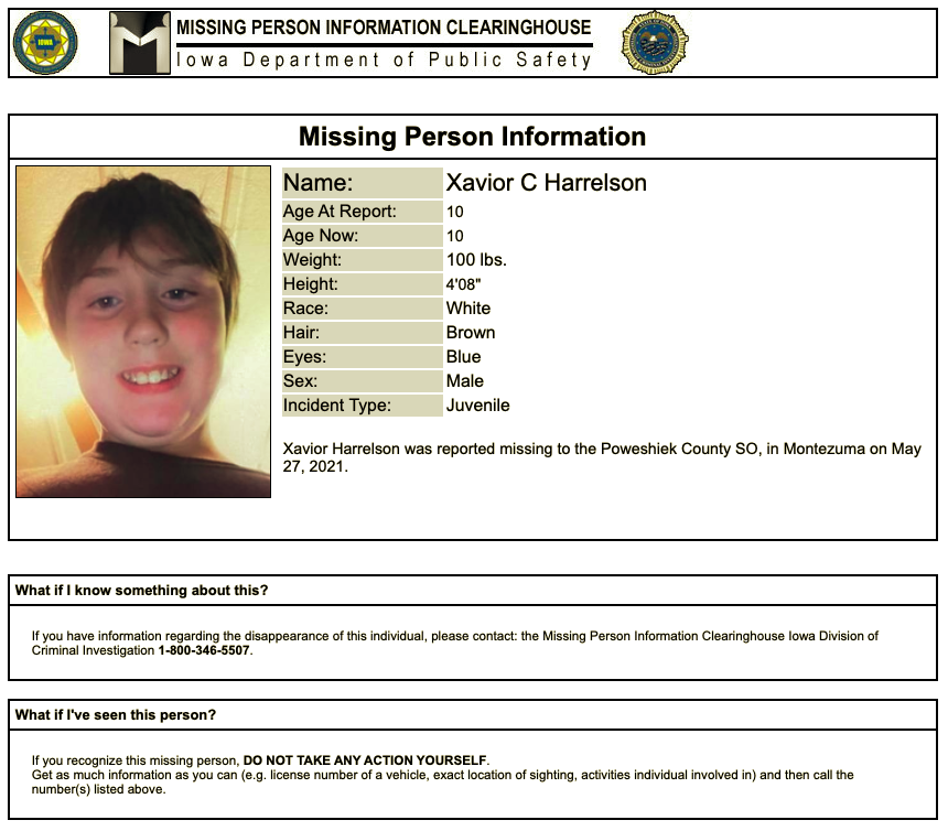 The Poweshiek County Sheriff's Office has taken a missing juvenile report from Montezuma. 10 year old Xavior Harrelson was last seen 5-27-21 at 11am in Montezuma. Wearing red T-shirt, blue pajama pants and black high top shoes. Xavior is approximately 4'8" tall and 100 .lbs. He has brown hair and blue eyes. If anyone knows his whereabouts or has seen him contact the Poweshiek County Sheriff's Office 641-623-5679