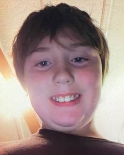 He has brown hair and blue eyes, and he is about 4′8″ tall and 100 pounds.