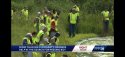 He was wearing a red T-shirt, blue pajama pants and black high top shoes.