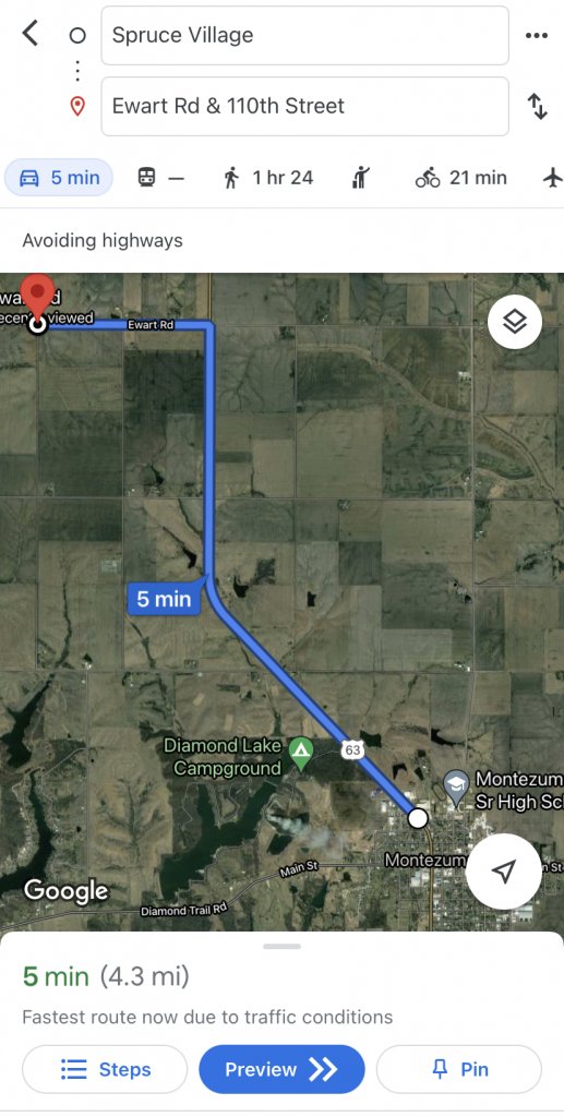 The approximate distance from Ewert Rd to Spruce Village Trailer Park where XH last lived with his mother is about 4 miles: