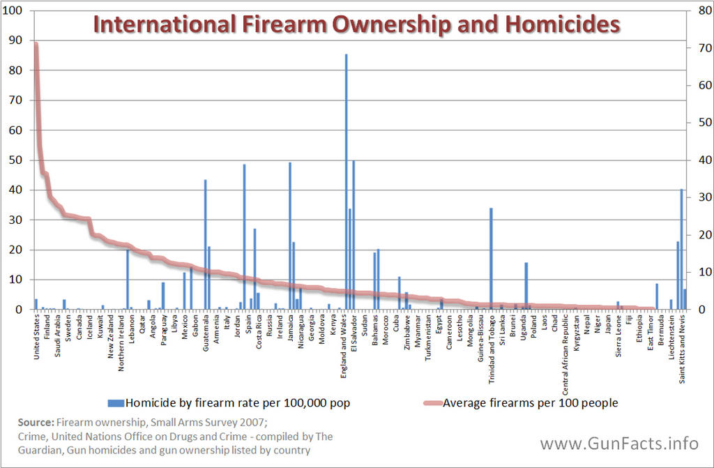 Worldwide, there is no discernible correlation between rates of gun ownership and homicide rates. This is pretty much the whole darn cherry tree: