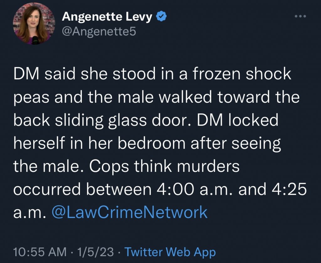Exactly. We're all looking at her actions with the knowledge that 4 people had been murdered. She had no reason to know anyone was dead. So a door dash delivery has just happened, people have been coming home, she hears some snippets of conversations, and then opens her door to see what's going on, a man passes by her. She probably figures things are finally going to quiet down, locks her door and goes back to sleep.