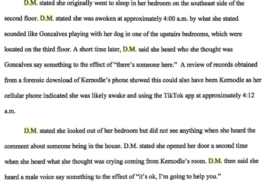 I stated this on another post, another viewpoint is it’s college life, how many unannounced guest came and went from that house? Another poster commented that if it was a Covid type mask (The description was a mask that covered his mouth and nose so sounds like a Covid mask not a ski mask) that in itself is not alarming or suggestive of criminal activity. Yes, she was startled by the presence of an unexpected person but again is that the first time that that has happened? Did her hearing, it’s OK I’m here to help, make her think the situation was being handled and her intervention was not necessary? She thought one of the roommates was playing with the dog, again that doesn’t suggest foul play. doorDash was delivered moments before the murders putting the meal delivery in the 3:45 AM range, normal middle of the night activity for this house so not unusual? I know it’s not common for delivery drivers to come in the house but again college life, college kids, did she just think it was a delivery person or a friend of one of the roommates who made the delivery, or the roommates brought someone home? I don’t think you can view her from the same lens/thought pattern as an adult who is always checking on children or others if hearing any type of noise etc. I don’t think her mind would necessarily go to the thought that possible harm was being done to her roommates. MOO