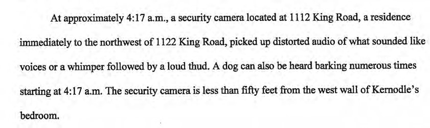 I probably should have expanded, but was being lazy, instead of quoting and attaching Exhibit A. Unless I'm mistaken, this is 1112, which is the home that had the Surveillance camera that picked up the audio. I don't think a camera on the front of the house, facing King Road, would be within that distance and would be more likely to pick up something from in front of the 1112 King Rd address. So, I do believe that there was surveillance on the side or back of the home due to the measurement being 50' or less from X's west wall of her room.