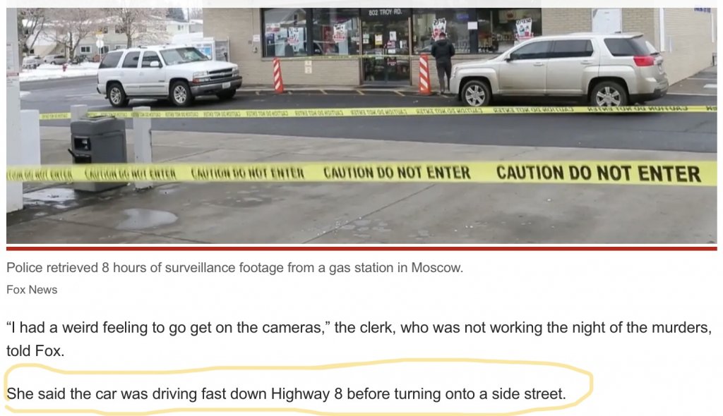 Detectives collected eight hours of surveillance footage from a Moscow gas station where a clerk claimed she saw a white sedan drive by around 3:45 a.m. the night the students were killed, Fox News…nypost.com