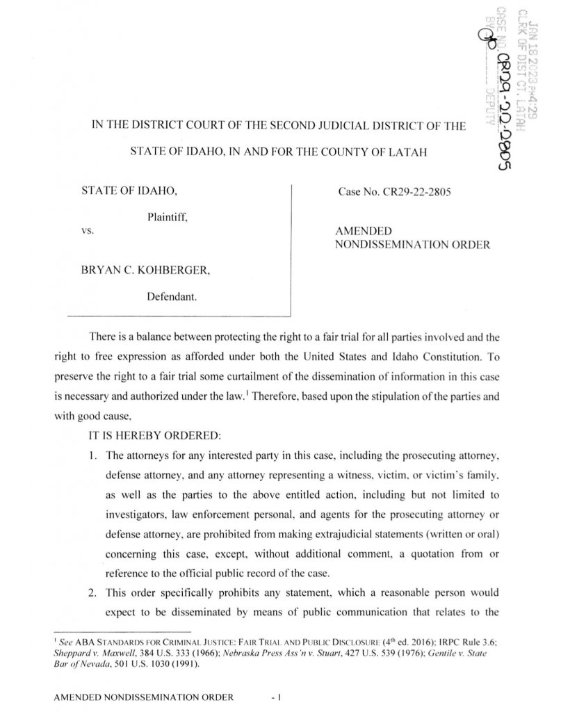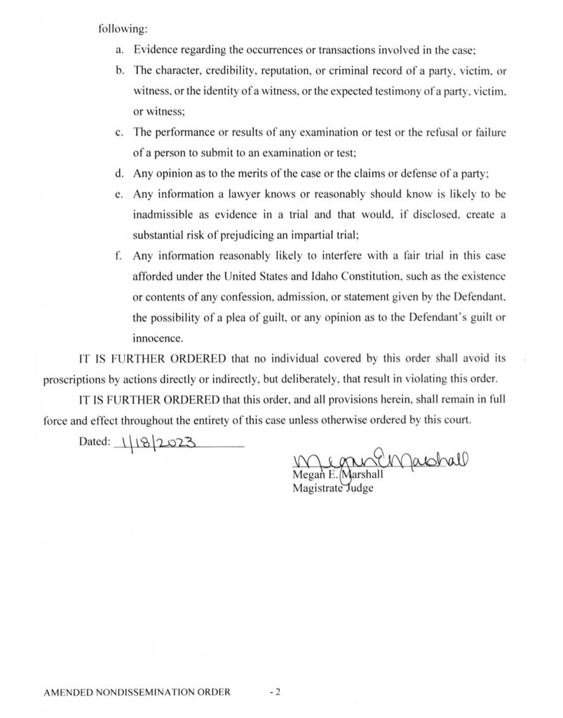 "New: A Latah County Magistrate has issued a new and more strict gag order in Bryan Kohberger’s case prohibiting attorneys for witnesses, (attorneys for) victims, and (attorneys for) their families from speaking about the case."