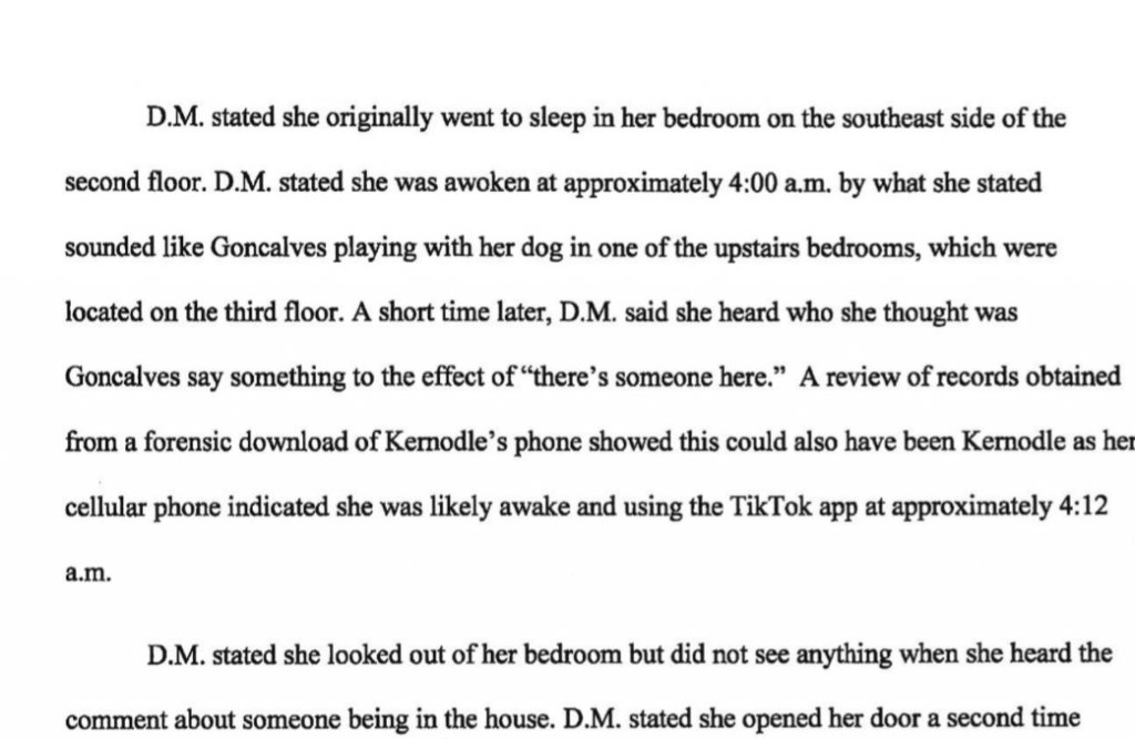 Per PCA, p4, DM confirms all roomates were in their rooms by 2am with the exception of Xana "who received a doordash at 4am...". It's not stated that KG was awake.