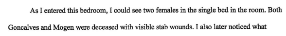 "D.M. said she opened her door for the third time after she heard the crying and saw a figure clad in black clothing and a mask that covered the person's mouth and nose walking towards her. D.M. described the figure as 5' I0" or taller, male, not very muscular, but athletically built with bushy eyebrows. The male walked past D.M. as she stood in a "frozen shock phase." The male walked towards the back sliding glass door. D.M. locked herself in her room after seeing the male. D.M. did not state that she recognized the male. This leads investigators to believe that the murderer left the scene."