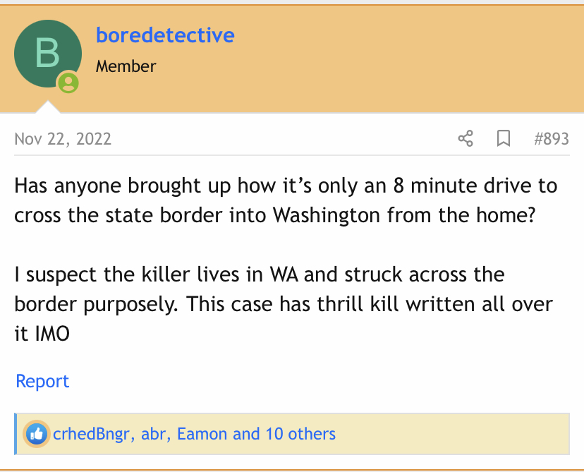 Also, it baffles my mind that a CrimJ PhD student would decide to drive 8 miles to murder someone in a state that has the death penalty, from a state that has a moratorium on the death penalty. Of course he would know that. That's why I am thinking this WAS targeted toward someone in that house. If it wasn't he would have killed somewhere in WA instead.