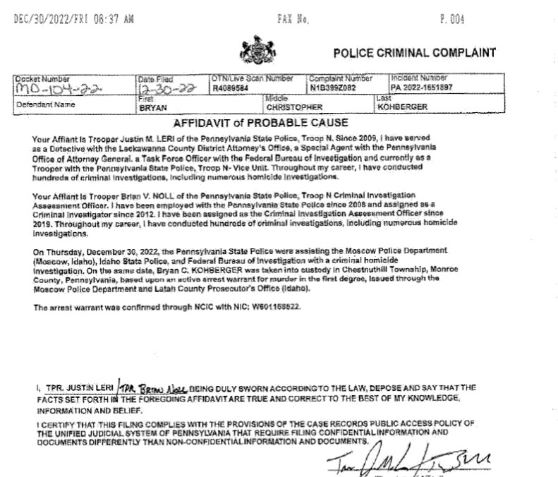 Document faxed 12/30/22 at 6:37 am (I think it's 6:37, not 8:37). This was probably faxed to the court to be filed after arrest. These are arresting officers? Note that this is P. 004 of the document.