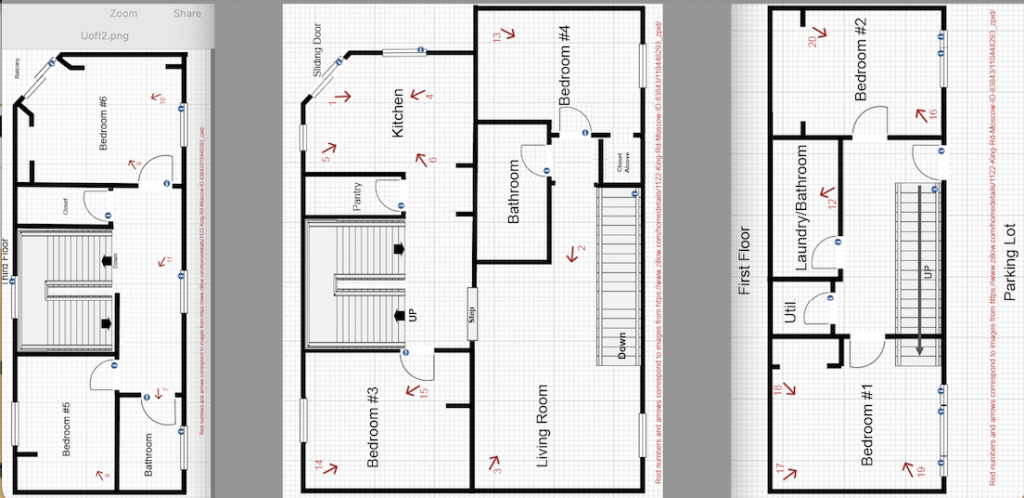 I think he’d have gone in through the second floor sliding door after he was sure everyone was asleep, not through the first door with the keypad, even though he might know their code. I believe the first floor only has one possible exit. He would not let himself be trapped. On the second floor, he would have three potential door exits. Even on the 3rd floor, more options and he’s in good shape, so he could jump from the third story window or deck, if needed.