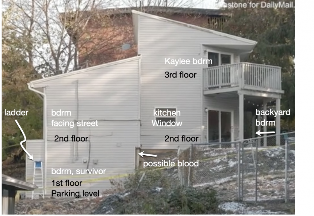 Does that mean it is blood on the exterior of the house, from the bedroom that faces the street (off the living room)? Is it a building materials stain on the side of the house? Why did a reporter think it is blood?I am from Rocky Mountains, WY and Colo, I can tell you there are ZERO homes here with "heating oil", I did not even know what it was til a made friends with someone from the east coast that used that and that was in my 50's One could not buy heating oil for a furnace out here if someone wanted to. That said, hard to imagine how could any liquid leak "out" of a house, even like water in an overflowed bathtub.