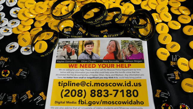 A flyer seeking information about the killings of four University of Idaho students who were found dead on Nov. 13, 2022, is displayed on a table along with buttons and bracelets, Wednesday, Nov. 30 during a vigil in memory of the victims in Moscow, Idaho. (AP Photo/Ted S. Warren)