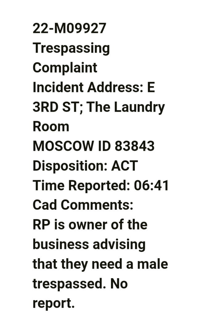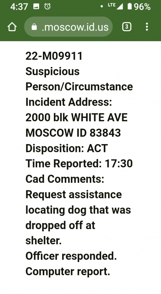 Questions come up like, why was a male trying to get into the community laundry at 641am, what was so urgent to wash? What prompted animal rescue to call police when the "responsible party" (is that JD?) simply came to pick up Murphy? Who went to the ER that same evening and locked a dog in their car while being treated? The Moscow police logs can be viewed in detail at search; Moscow Idaho PD call logs.View attachment 385573View attachment 385574View attachment 385580View attachment 385578