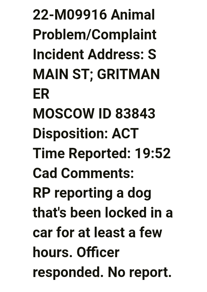 Questions come up like, why was a male trying to get into the community laundry at 641am, what was so urgent to wash? What prompted animal rescue to call police when the "responsible party" (is that JD?) simply came to pick up Murphy? Who went to the ER that same evening and locked a dog in their car while being treated? The Moscow police logs can be viewed in detail at search; Moscow Idaho PD call logs.View attachment 385573
