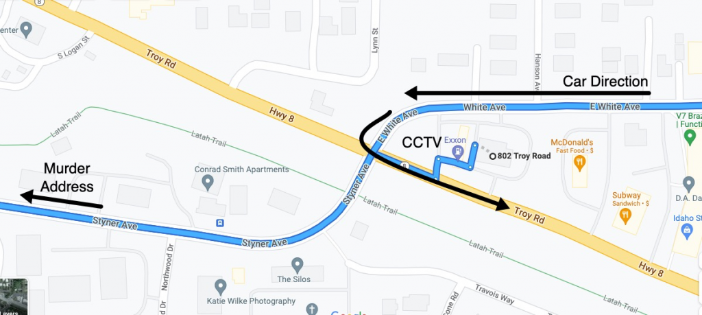 Given the direction of the car, either he was driving to the murders, which throws off police timeline, or he took a circuitous path from the house to Troy Road/ Hwy 8 after the murders.