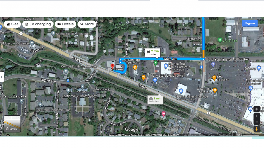 Interpreting from a map, turned off of hwy 8. Meaning on to White Ave. That would mean, turning on White Ave before reaching the gas station and the image of the car would be traveling toward the right.