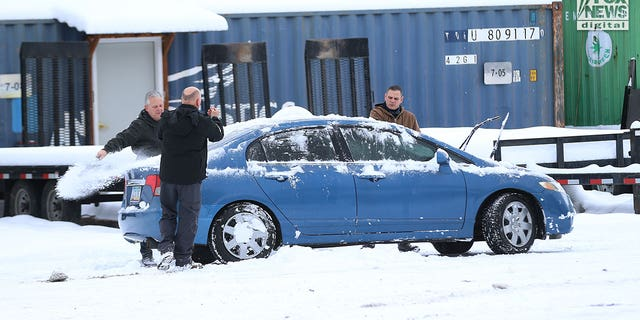 Images captured by Fox News Digital show people removing snow from a blue Honda sedan bearing Arizona plates and then driving it away from the tow lot on Dec. 20, 2022. The vehicle was one of the cars that was towed away from the crime scene and moved to the lot weeks earlier.