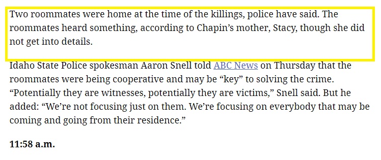 I think they have a good idea about who this *might* be, and this person has to be handled very carefully. I would wager more than my lunch money that said person is living on the down-low right now (my lunch money is about $1). If I had to guess, I'd say he's still on campus. I have theories about his lifestyle, but they are based only on the examples of now-incarcerated students who have acted out on various campuses, mostly in my own neck of the woods. I believe LE is keeping an eye on this person or persons.