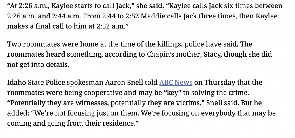 "Investigators have determined that Ethan Chapin and Xana Kernodle were seen at the Sigma Chi house on the University of Idaho Campus at 735 Nez Perce Drive. At approximately 1:45 a.m., Ethan and Xana are believed to have returned to the residence at 1122 King Road. It was previously reported that Ethan resided at the home; however, it has been determined that he was only visiting.
