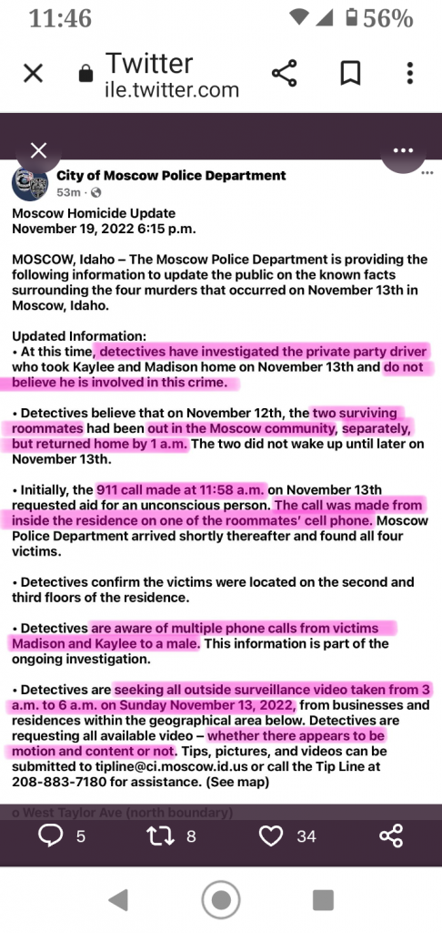 I can’t even begin to imagine what the scene entailed, nor do i want to do so. I know that Moscow, Idaho isn’t exactly murder central and that some of the authorities working the scene and making these statements aren’t used to seeing shocking murders on a frequent basis. But these are still lawmen who have had (presumably) long careers and have worked murder scenes before. The FBI agents there have definitely seen some horror shows in their day as well. And when these people are making statements about this particular scene being unlike anything you will see again in the future, it just defies logic and belief what must have happened inside. I was thinking sights of arterial spray, pools and streaks of blood, etc., but it sounds even worse than that.