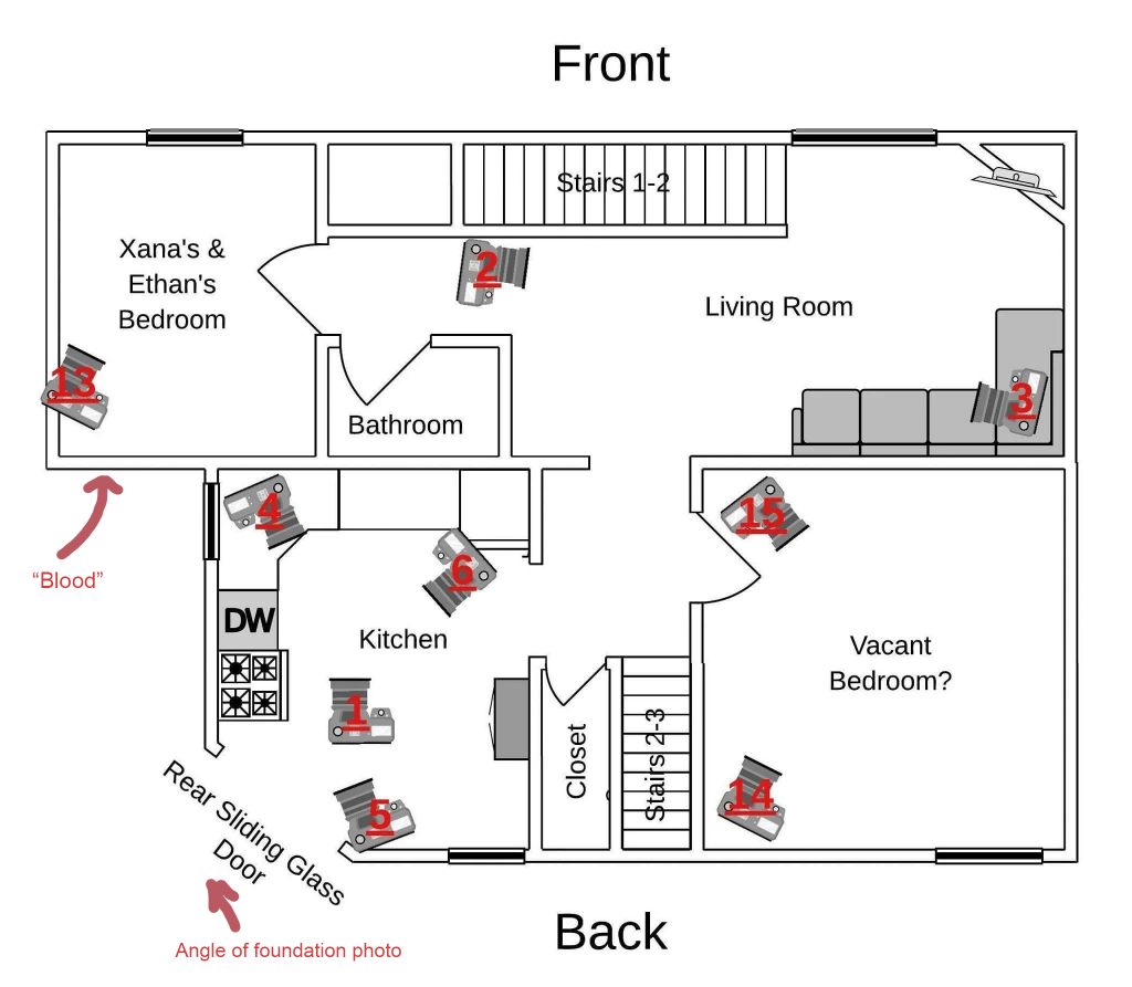 Thank you, Otto!!I've added the location of the dripping blood reported by DailyMail. If the second and third floor roommates returned home around 1:45-2:00 AM, then their bedroom lights would have gone out shortly afterward - perhaps as late as 3 AM. After the lights were out, that could be when the attack occurred - when someone believed that they were asleep.