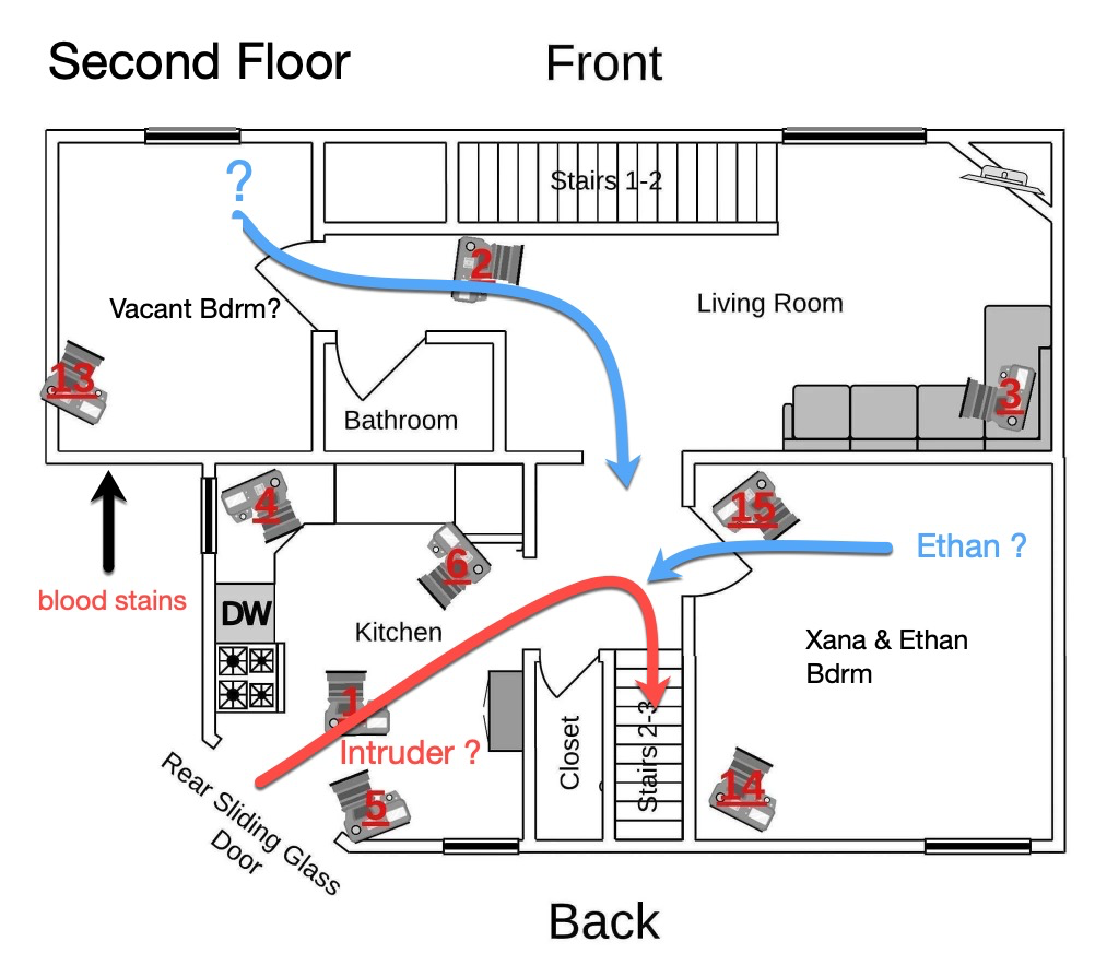 I wonder if the perpetrator enters from the back of the house, essentially on level 2, and is unaware in the dark that there even is a level 1 where the survivors were asleep?