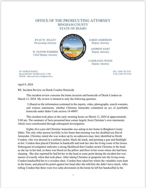 [ETA:This is sheriff's FB page which has a pdf of Bingham County Prosecuting Attorney's Ap. 9 memo, Incident Review Of Derek Condon Homicide. Basically recites fact-finding, section of ID law, and why no prosecution.]