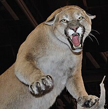 As with many predators, a cougar may attack if cornered, if a fleeing human stimulates their instinct to chase, or if a person "plays dead". Standing still however may cause the cougar to consider a person easy prey.[SUP][1][/SUP] Exaggerating the threat to the animal through intense eye contact, loud shouting, and any other action to appear larger and more menacing, may make the animal retreat. Fighting back with sticks and rocks, or even bare hands, is often effective in persuading an attacking cougar to disengage.[SUP][2][/SUP][SUP][3]