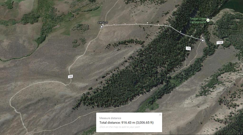 Oh, Very good question. I don't think we looked at that before. It looks like Forest Road 105/Big Timber Creek Road is only a bit more than 1/2 mile (3006 feet) from the campsite!