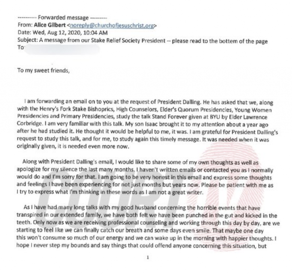 Among other things she points out in the letter that she and her husband were blamed and ostracized by the extended family for expressing concern and trying to warn others about Chad's beliefs.
