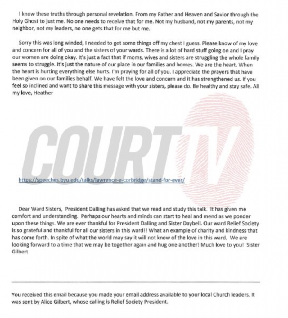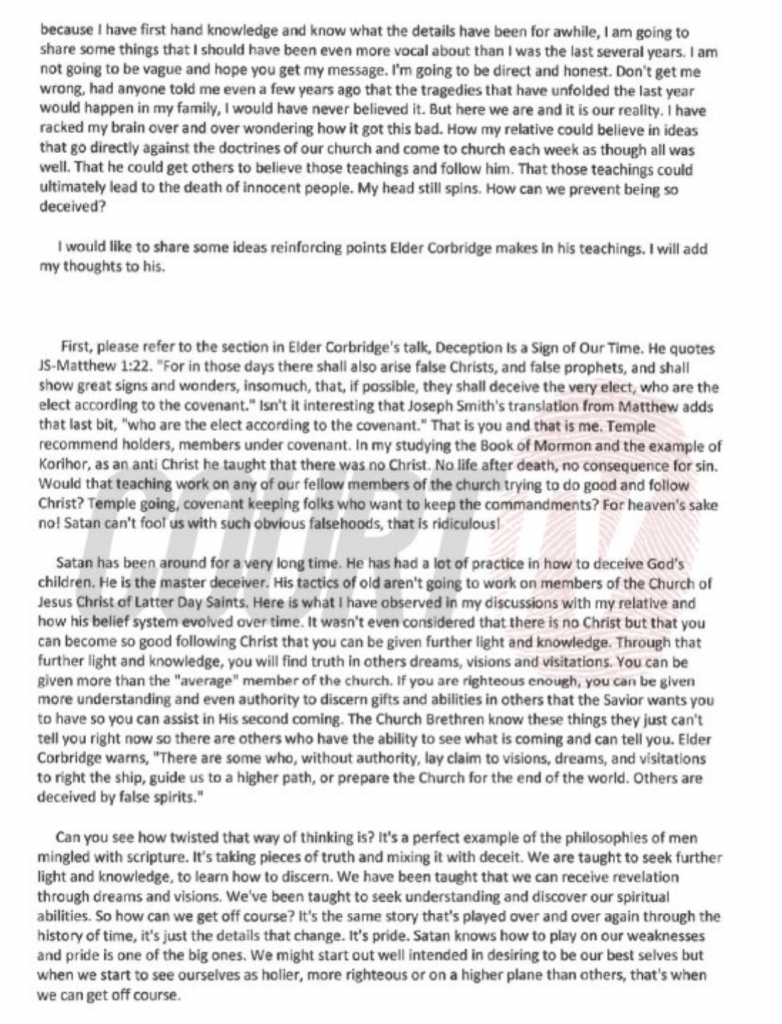 I'd guess that this letter from the sister in law stems instead from a dual motive (among others) of trying to clear her own name from the suspicion that seems to follow everyone in Chad and Lori's circle as well as reinforcing a narrative that the Church has nothing to do with Chad's alleged misdeeds. In addition, she's probably dealing with the real anguish of trying to figure out why a close family member could have gone so far off the tracks, and maybe also trying to help her (local stake) community (one in which a healthy number may have been somewhat attracted to Chad's/AVOW's/PAP's messages) with trying to coalesce back around mainstream LDS beliefs.