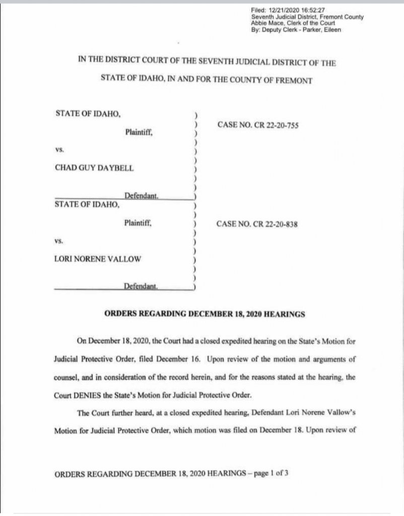 12/28/20 Update: Judge Steven W. Boyce: Orders regarding 12/18/20 Hearings: The court had a closed expedited hearing on the State's Motion for Judicial Protective Order (filed 12/16/20). Upon review of the motion & arguments of counsel & in consideration of the record herein, and the for the reasons stated at the hearing, the Court DENIES the State's Motion. Further heard Defendant Vallow's Motion for Judicial Protective Order (filed 12/18/20). Upon review of the motion & arguments of counsel & consideration of the record herein, and for the reasons stated at the hearing, the Court DENIES Vallow's Motion. Also the Court heard argument on Defendants' joint Motions to Extend Time on Motion to Dismiss. Based upon the stipulation of all parties at the hearing, the Motions to Extend Time is GRANTED. By further stipulation of the parties, the Court will vacate the hearing on Defendants' joint Motions to Change Venue scheduled on 1/6/21. The Defendants' joint Motions to Disqualify Prosecuting Attorney will now be held on 1/6/21. Defense (Daybell) requested an in-person hearing. But due to COVID Judge says hearing will be conducted remotely via Zoom. Defense (Daybell) also requested that the 1/6/21 hearing be closed. But defendant Vallow objects to closure of hearing. The Court has taken that issue under advisement & the parties by submit written supplement argument and/or authority on the issue of closing the hearing and must be submitted by 5pm, 12/30/20.