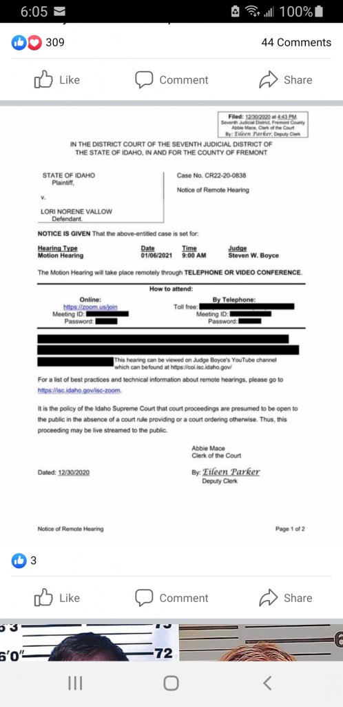 9/21/20 Update: Defense attorney Mark Means filed 2 motions in Lori's case in Madison County: 1) motion for transfer and joinder with her case in Fremont County and 2) motion for venue change. Pretrial hearing on 1/4/21. Trial set to begin on 1/25/21.