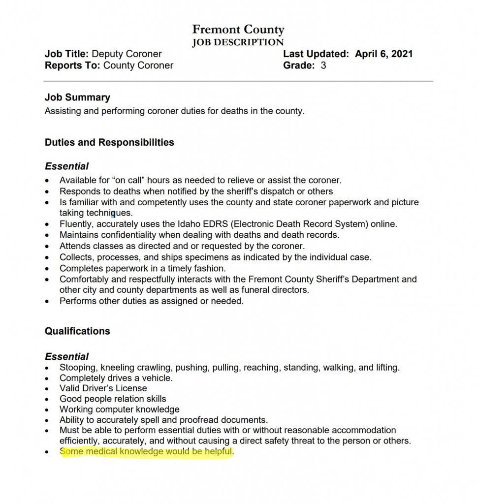 Isn't the Fremont County coroner an EMT?Tangentially related I guess, but I just saw this elsewhere, appears Fremont County is still looking for a Deputy Coroner....the last line of the essential qualifications....well, I guess it can be tough to find to find more experienced and classically trained people in very rural/remote areas