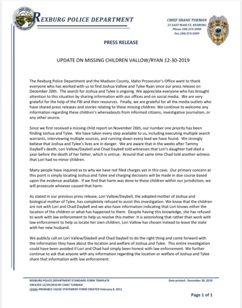 UPDATE: Just got off the phone with Fremont County Sheriff Len Humphries in Idaho. I’m told we should expect a new press release from Rexburg Police with an update on the search for JJ and Tylee. I’m told there’s new detail on their mother Lori allegedly being untruthful on their whereabouts and continuing to not cooperate in the investigation.