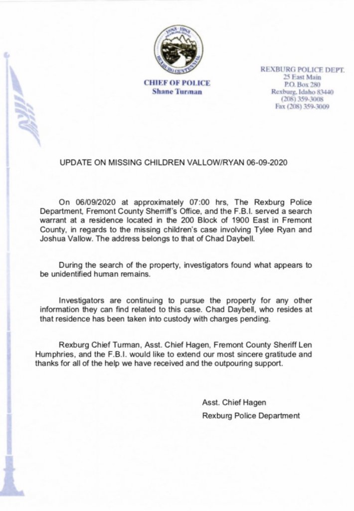 Rexburg Police just sent out a press release regarding the search for the missing children and the unidentified remains found on Chad Daybell’s property. He was taken into custody and charges are pending. #azfamily