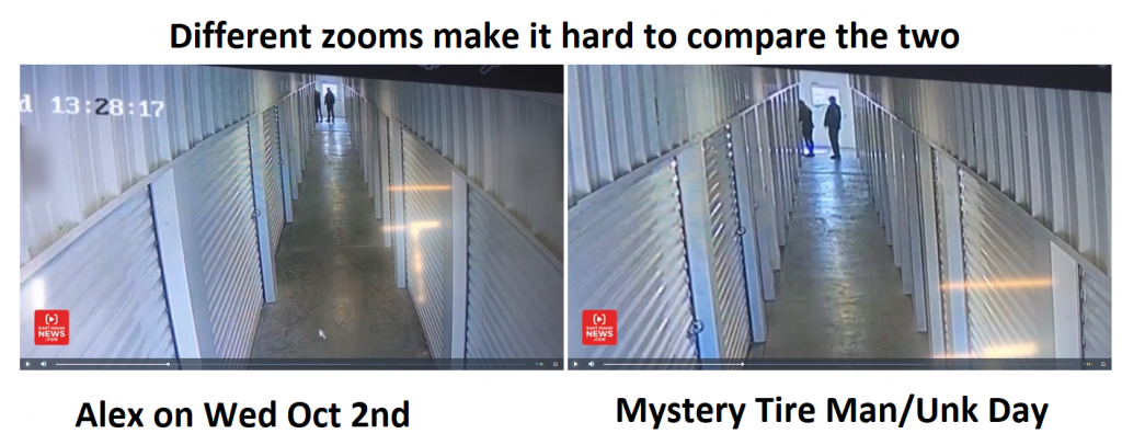 Unfortunately, different zoom levels make comparison difficult. Look how much smaller the window is in the door on the Oct 2nd image. I tried to crop/enlarge and make the two images the same size using the window as a guide but the window shapes were different, probably indicating a video of the video was taken at a slightly different angle for each date. I'm bad at scaling images and I gave up after fiddling with it for a bit in Paint. :p But this is a comparison I would love to see @grayhuze do in video to try to help us figure out if the man seen with the Tire on an unknown-to-us date is the same height and build as the man Nate says is assumed to be Alex seen on Oct 2.