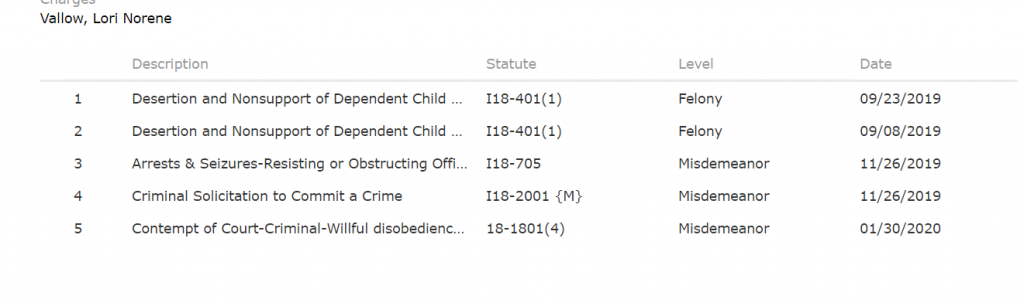 One result comes up for Lori Norene Vallow. Click that and you see this for the charges.